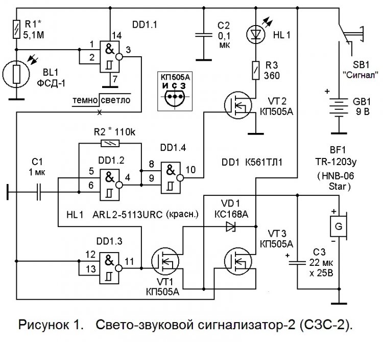 Светозвуковой сигнализатор-2 - одна из немногих схем, воплощённых в завершённую конструкцию, но в настоящее время являющейся лишь спорной идеей, призывающей к обсуждению проблемы.