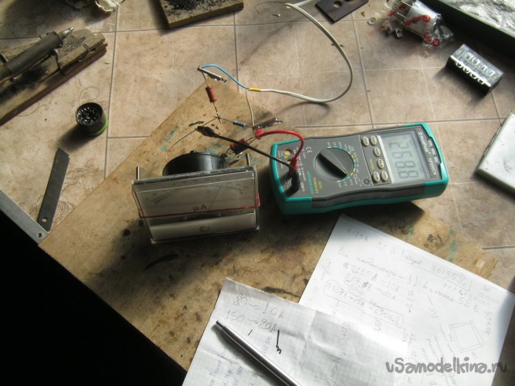 Зная ток полного отклонения стрелки микроамперметра и максимальное подаваемое от измерительного шунта напряжение, рассчитал добавочное сопротивление. Более-менее точно, удалось его подобрать из двух разных параллельно включенных МЛТ-2 (Фото 23).