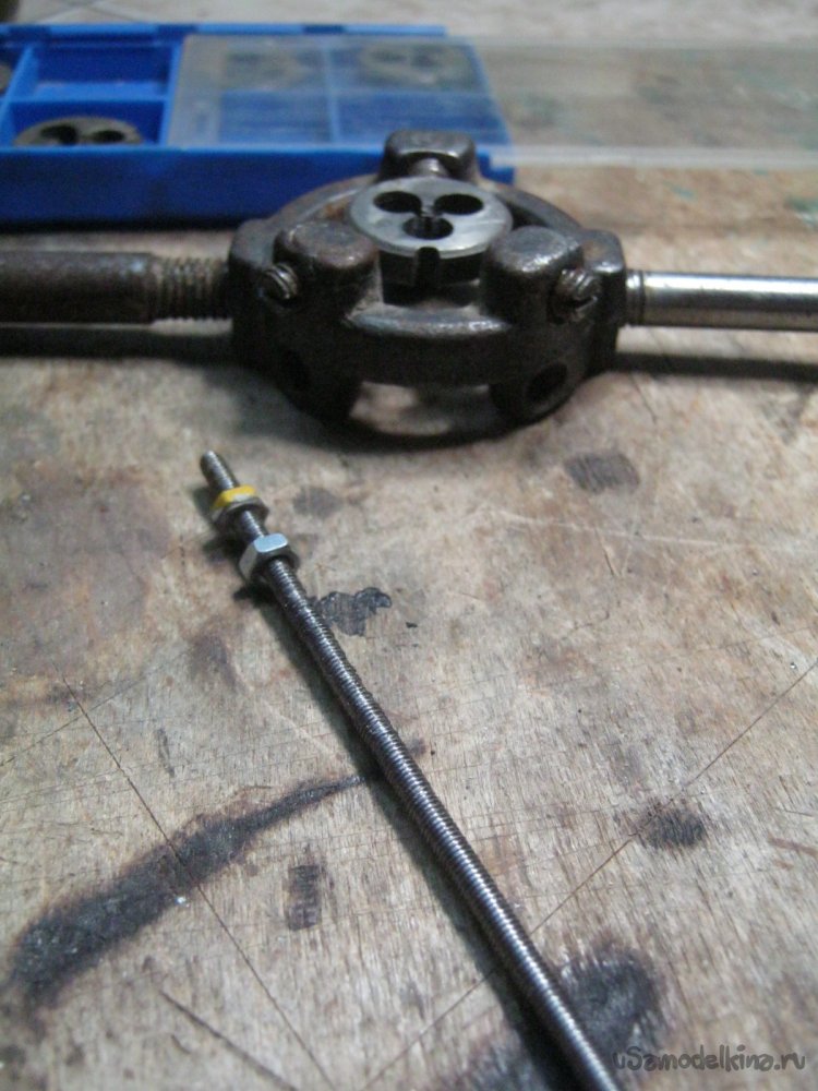 Штангу для измерительной головки сделал из отрезка нетолстой квадратной трубы. Притупил острые края железки, в два слоя покрасил ее сереньким грунтом-эмалью. Разметил и просверлил пару отверстий для крепежа к элементам конструкции БП электролизера. Понадобившиеся длинные винты М3 заменил на самодельные шпильки. Пару таких шпилек сделал из огарка электрода УОНИ (марки ESAB, Россия, г. Санкт-Петербург) – сбил с электрода обмазку, остатки удалил плоскогубцами. Зажав чистый хвостовик в патроне шуруповерта отшлифовал стержень-заготовку несколькими номерами некрупной наждачки, напильником сделал фаску. Подобрал лерку, нарезал резьбу (Фото 5…7).