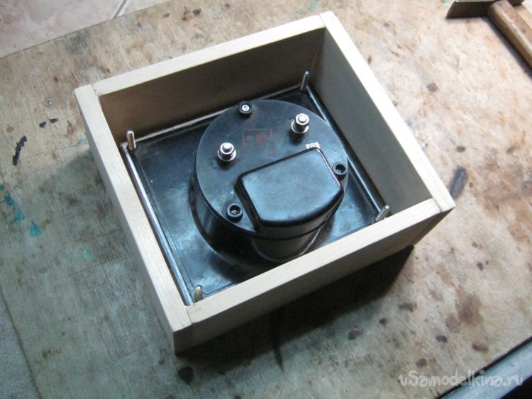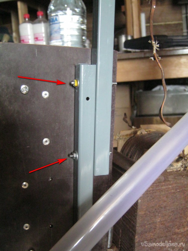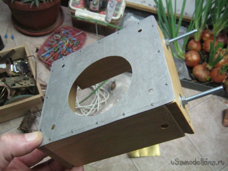 Фото 15. Примерка крепежа к штанге. Длинные винты М5 с парой широких (кузовных, усиленных) шайб, чтобы не проминалось дерево. Снаружи корпуса прибора на винтах затянуты гайки – чтобы удобнее крепить собранную закрытую коробку к штанге.