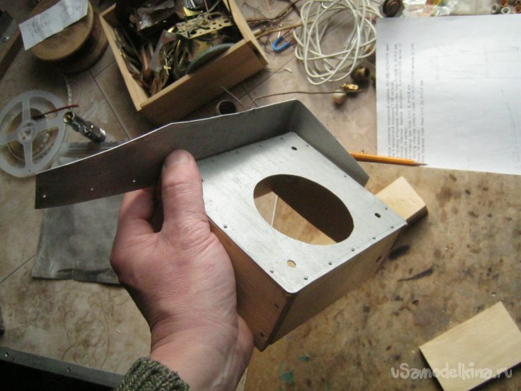 Фото 17. Заготовку – развертку козырька гнул прямо на коробке. Видны отверстия для крепления к деревянной части – теми же обрезанными гвоздиками.