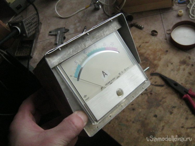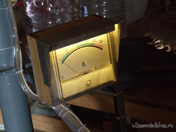 В этом смысле волевым решением принят единственный стрелочный измеритель-«показометр» потребляемого реактором электрического тока. Измерительная часть амперметра – токовый шунт, установлен в управляемом выпрямителе блока питания (БП), часть индикаторная – милливольтметр, вынесен на недлинной штанге вверх, этаким светофорно-перископным образом. Своеобразная конструкция исходит из размещения реактора с БП в мастерской – вблизи рабочего стола, но за массивной кирпичной дровяной плитой. Это снизит вероятность душа из разлетающейся горячей концентрированной щелочи (электролит) при гипотетическом разрушении реактора от подрыва (обратный удар). Амперметр обращен лицом в сторону «оператора» и вынесен вверх. Достаточно чуть повернуть голову.