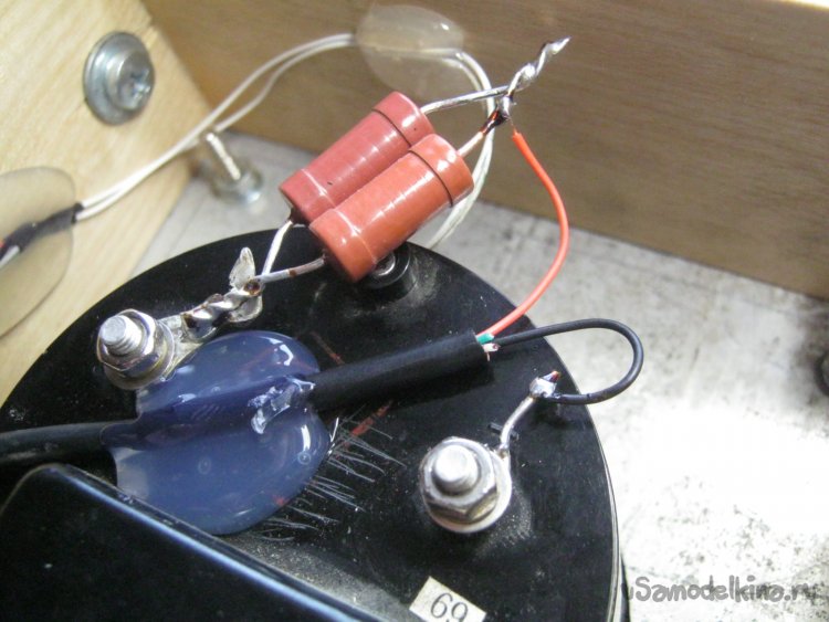 Фото 23. Вид на электромонтаж измерительной части. Кабель экранированный, экран присоединен к минусу «внизу» - в БП. Конец кабеля закреплен лужицей термоклея. Резистор – «добавочный», превращающий микроамперметр в милливольтметр.