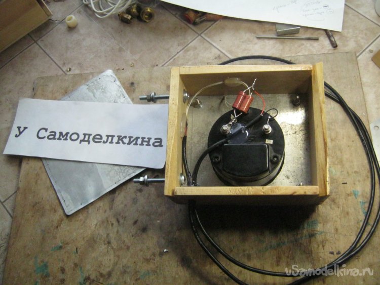 Перед сборкой коробки разметил и просверлил в деревянных боковых стенках три отверстия – пару для крепежа к штанге, одно для двух кабелей – напряжение с шунта и питание подсветки шкалы. Сверлил на станке, спиральным сверлом по дереву, на больших оборотах. При этом в плотной древесине получаются аккуратные отверстия без сколов и лохмотьев.