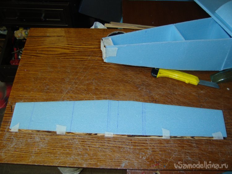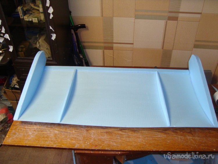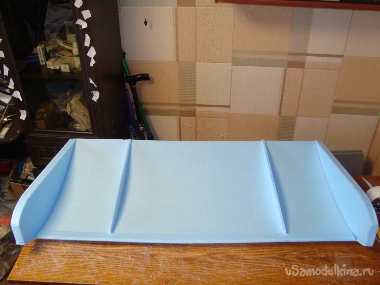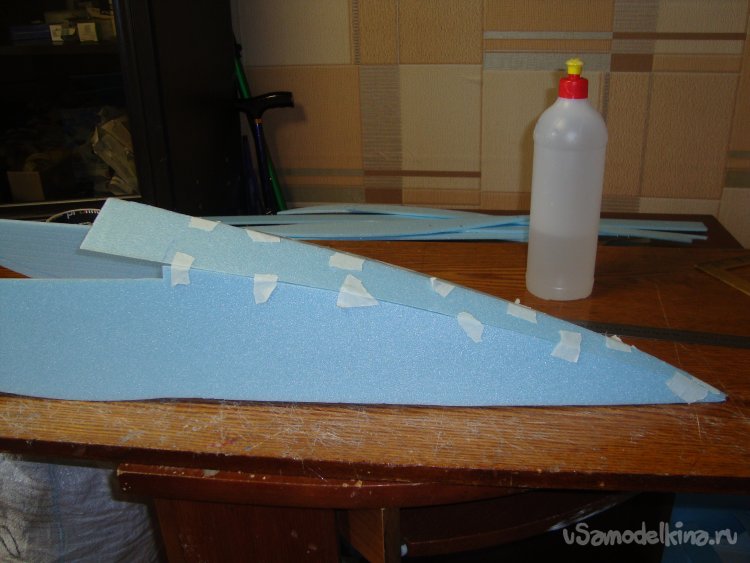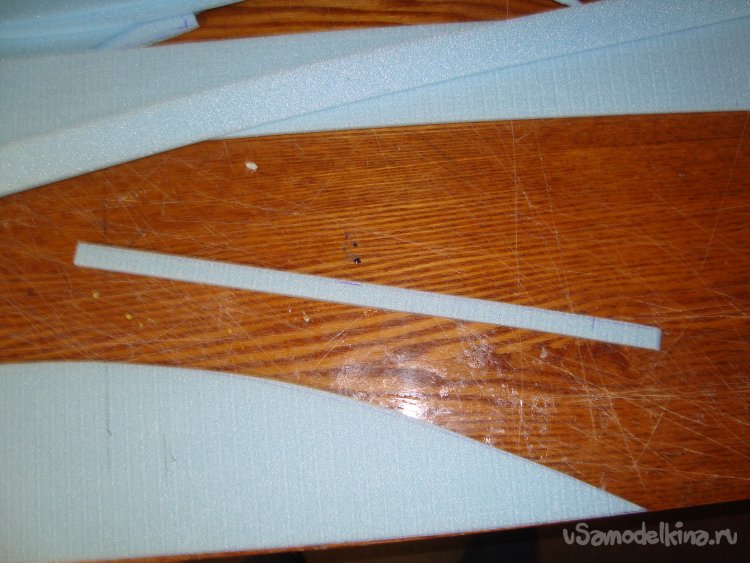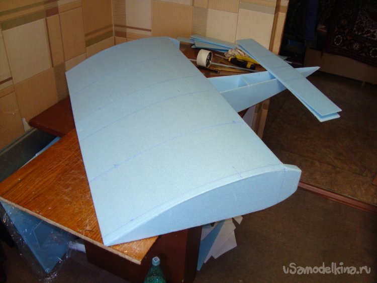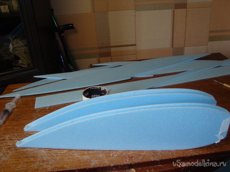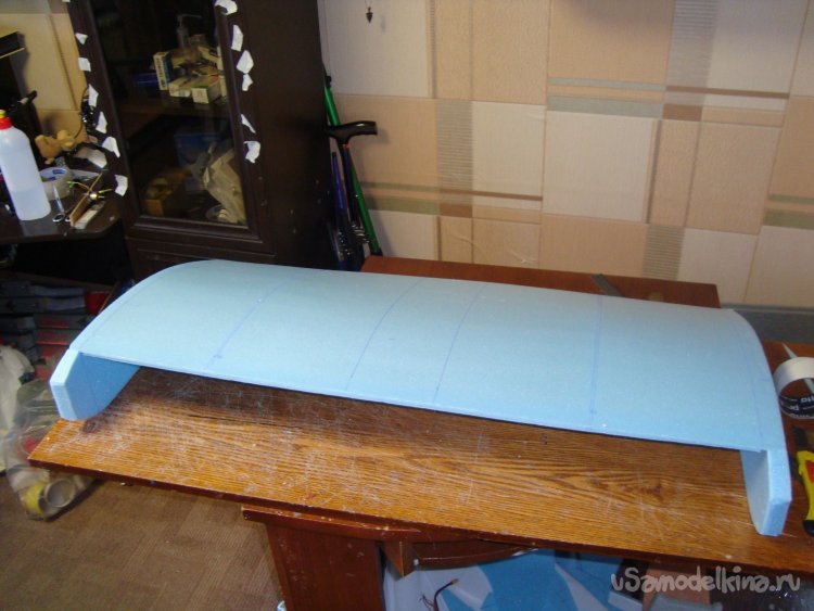 Перехожу у монтажу концевых шайб на крыло. Основу крыла составляет один целиковый лист подложки под ламинат размером 1000 х 500 мм.