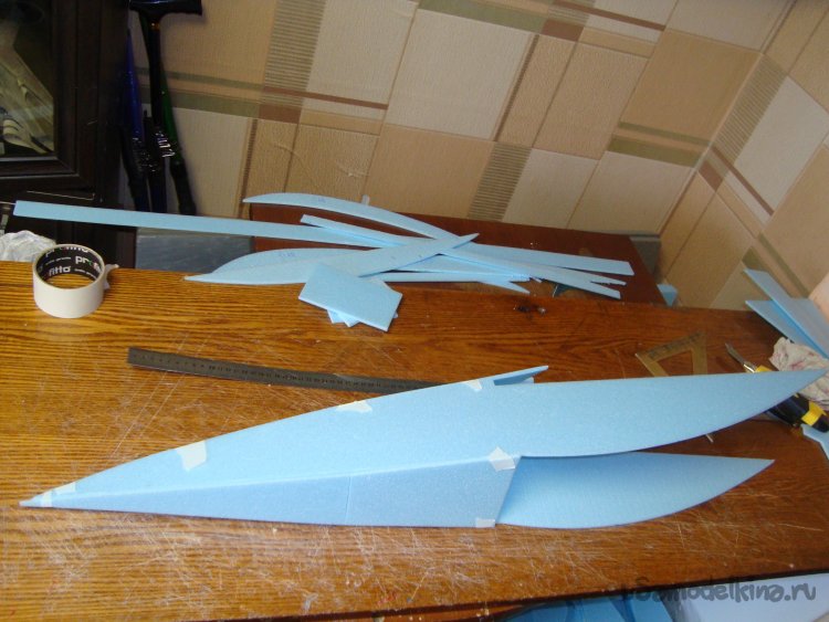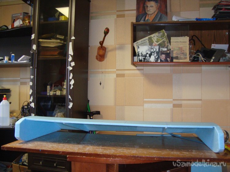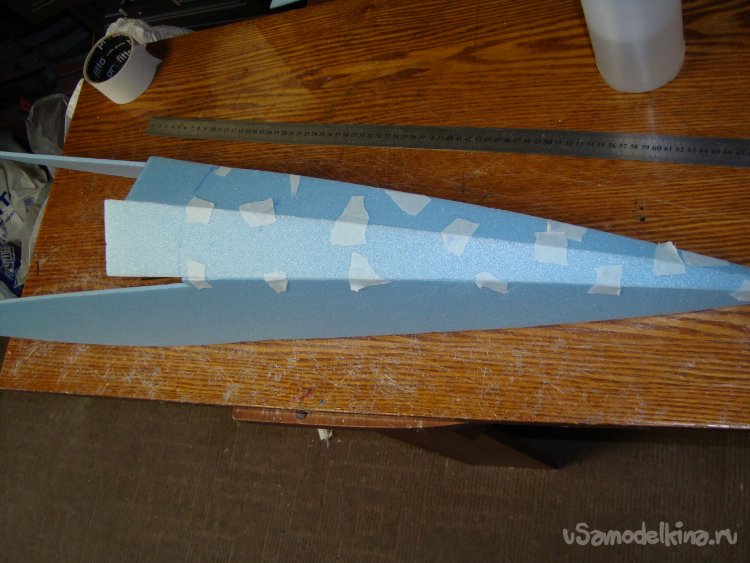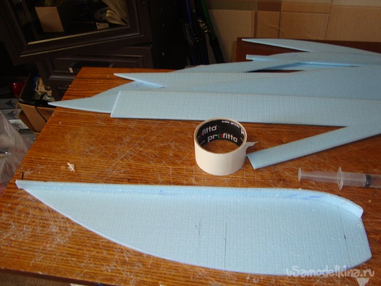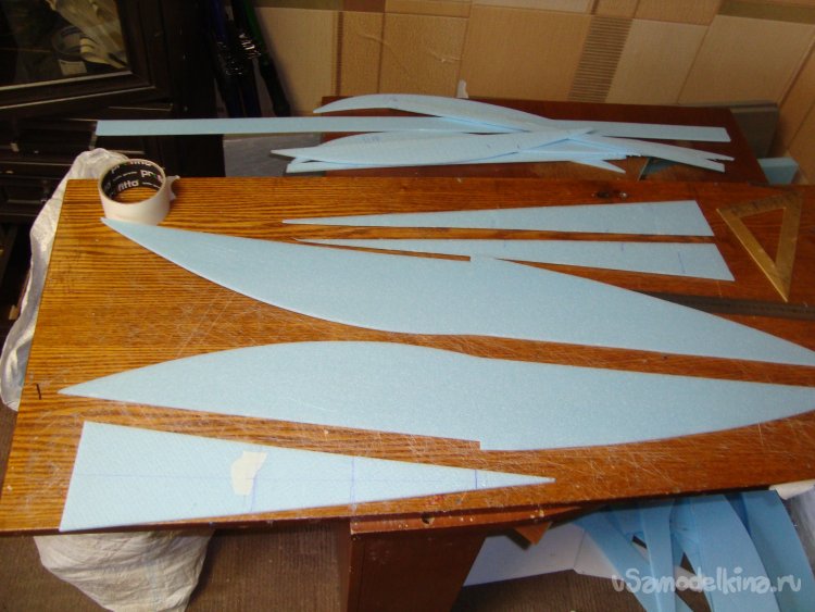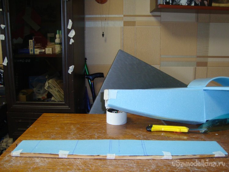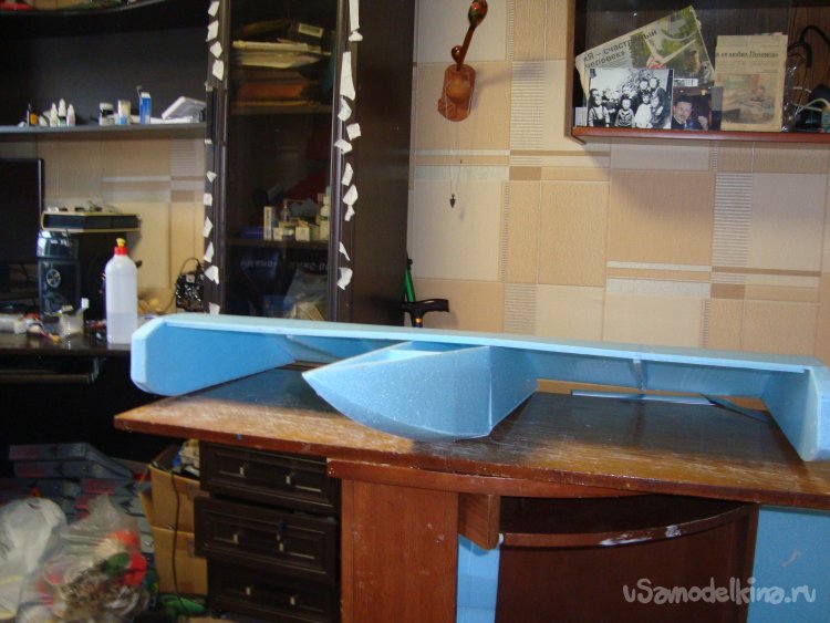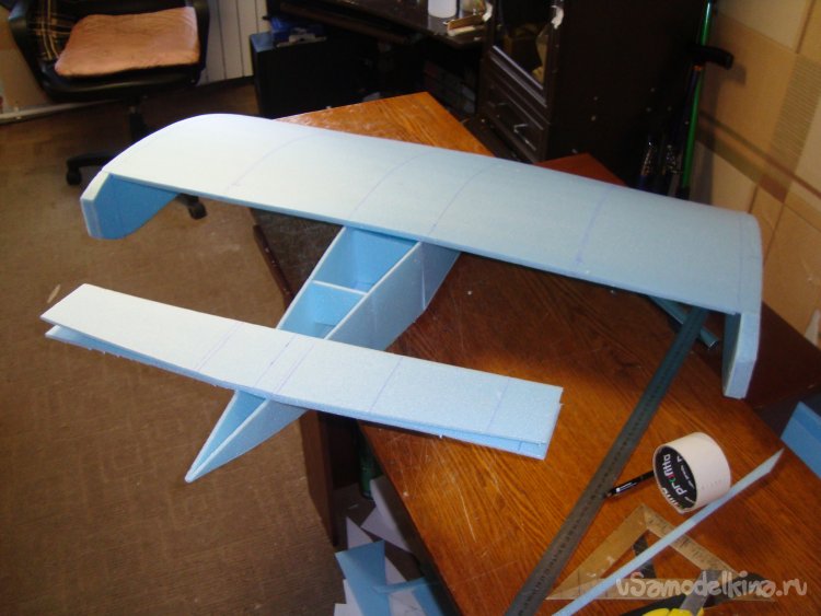 Перехожу у монтажу концевых шайб на крыло. Основу крыла составляет один целиковый лист подложки под ламинат размером 1000 х 500 мм.
