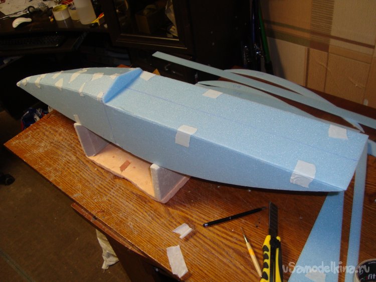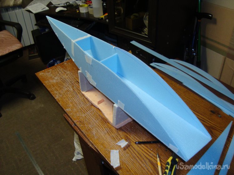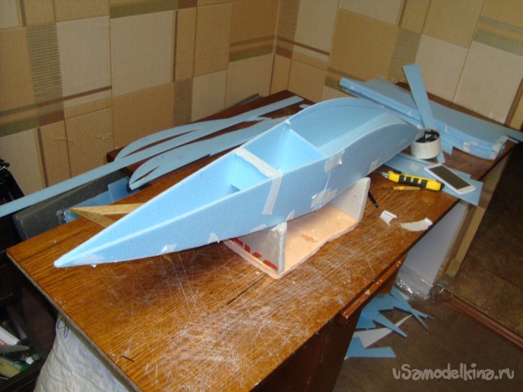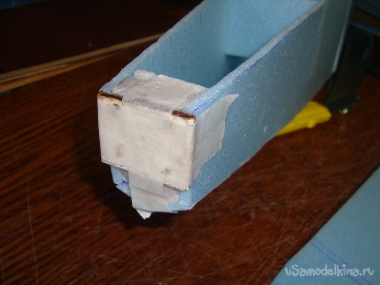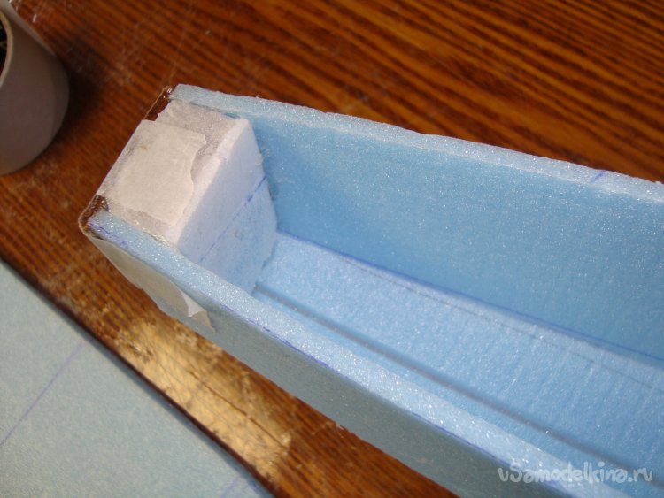 На первом этапе экспериментов решил поставить один мотор в носовой части корпуса модели. Для этого вклеил кусочек утеплителя «Пеноплекс», толщиной 20 мм. и кусочек оргалита (ДВП) на который будет монтироваться мотор.