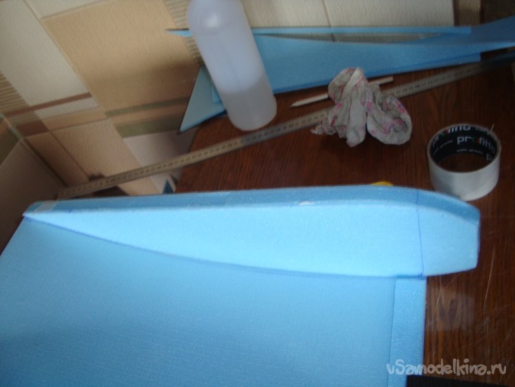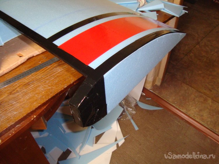 По передней кромке крыла . с нижней стороны, вклеиваю полоску подложки.