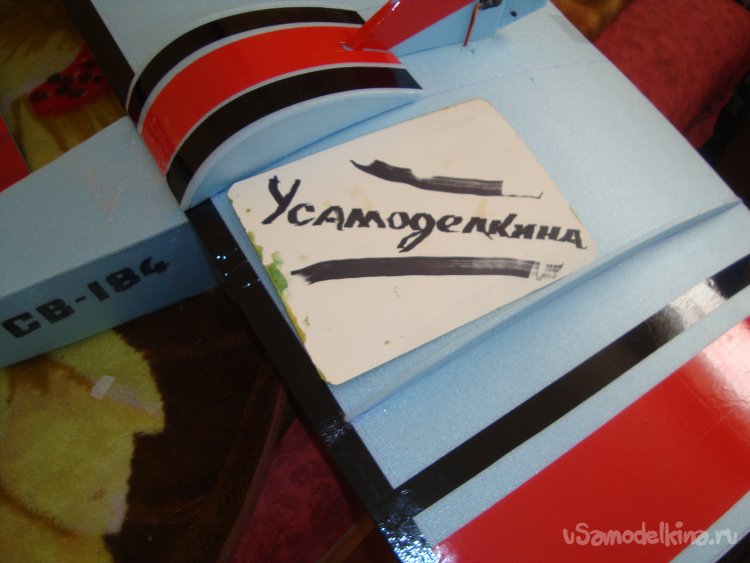 Из двух слоёв подложки склеил киль и руль направления. РН навесил на кусочек серпянки. Обтянул цветным скотчем. Смонтировал на место.