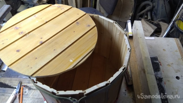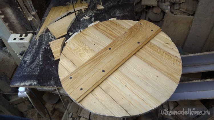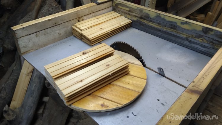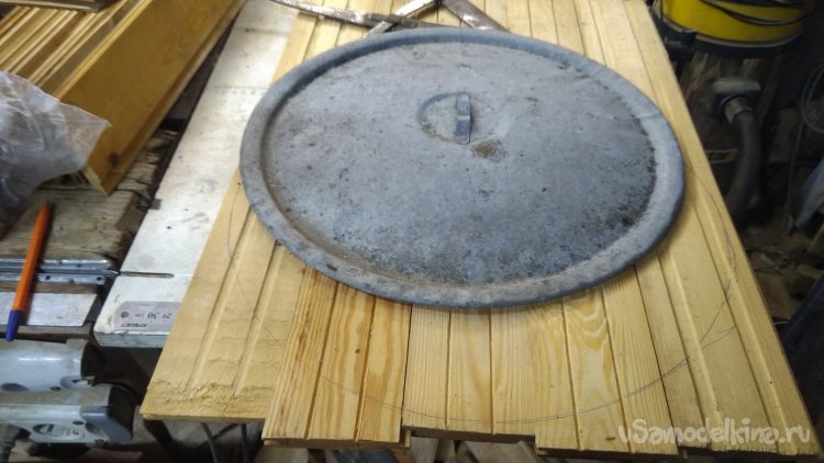 Обрезки вагонки, которые шли в дрова, использовал для постройки. Сначала собрал щит для пола, скрепил одной поперечной планкой на саморезах коротких. Очертил размер крышкой от бака и выпилил на самодельной ленточной пиле.