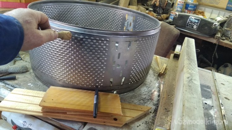 Длинна хомутов почти полтора метра, 140 см, купить такие проблематично, поэтому сделал из подручных средств. Бак от машинки автомата послужил источником материала, он нержавеющий, очень удобно, что не надо красить и как-либо защищать от коррозии. Пилится конечно болгаркой трудно, и кромки острые остаются, но при должной осторожности можно обойтись без травм. Боковые стенки использовал в качестве листового материала для хомутов, а крышку и донышко впоследствии для крыши. Ленты для хомутов вырезал древними электроножницами. После ремонта и настройки они режут всё, и бумагу простую, и нержавейку до 3 мм.