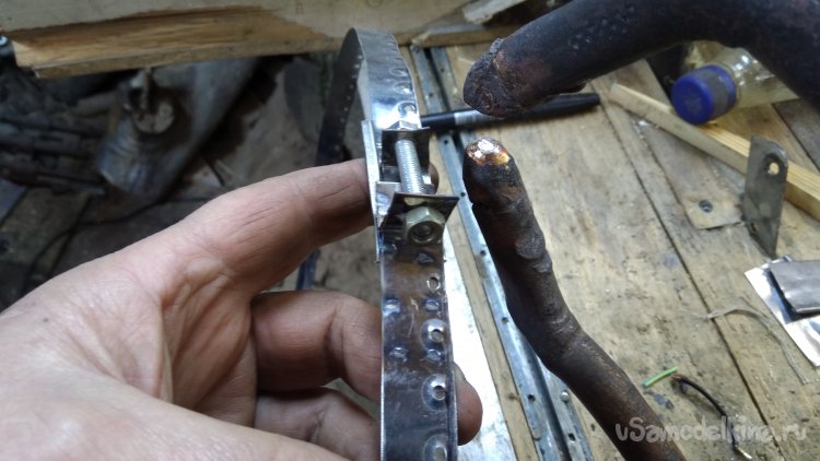 Полоски из нержавейки нарезал, сварил контактной сваркой усилители под места крепления болтов. Это просто хомуты очень большого размера ))