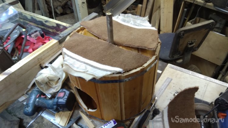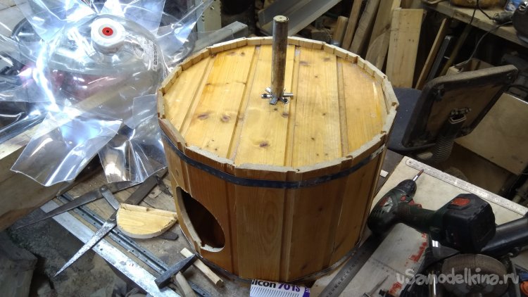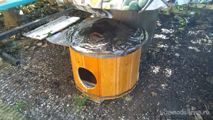 Сначала хотел сделать пластиковую крышу, по типу как в африканских хижинах делают из пальмовых листьев, но после нескольких безуспешных попыток добиться приемлемого вида переключился на остатки нержавеющего бака от стиралки ))