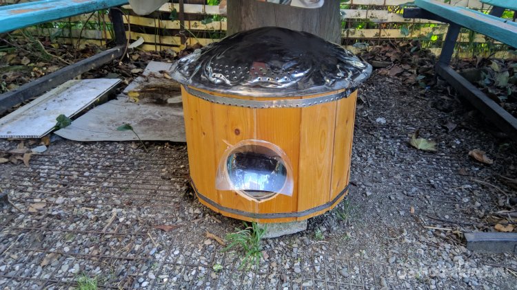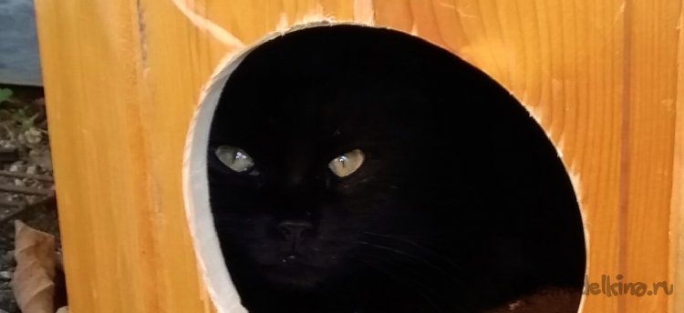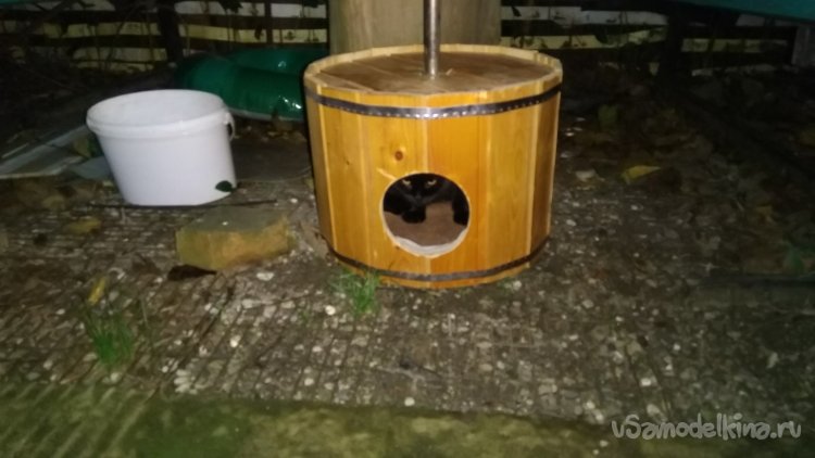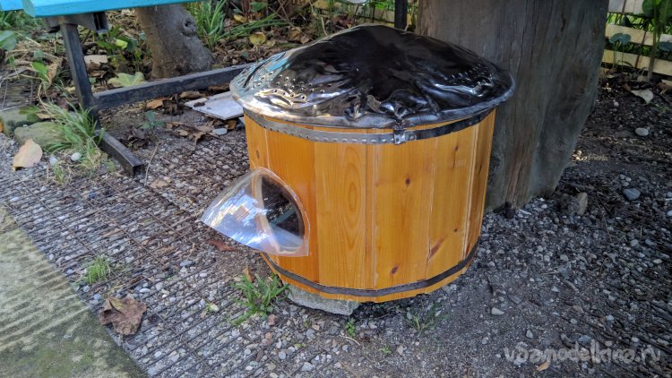 Незавершённый вариант был предложен к осмотру хозяйке домика, и был принят благосклонно с мурлыканием. На следующий день, кормом сухим выманил кошку из домика и прикрутил крышу к домику.