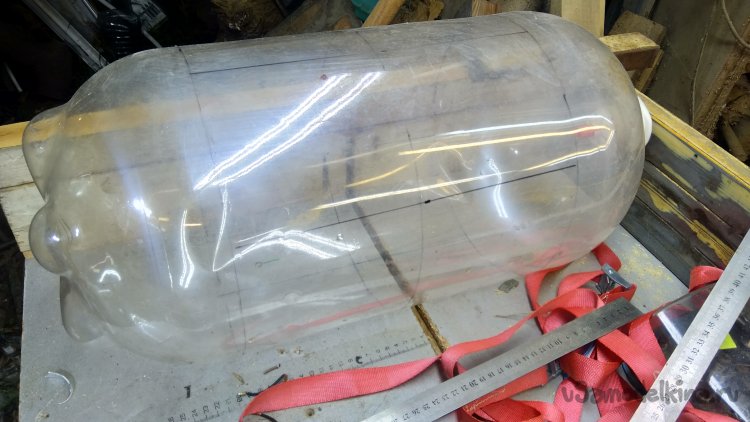 Фломастером отметил то что мне надо сейчас. Положил фломастер на кучку прокладок необходимой высоты, и провернул бак вдоль фломастера, получилась ровненькая линия, поднял на высоту нужной по ширине полоски, и провернул ещё раз.