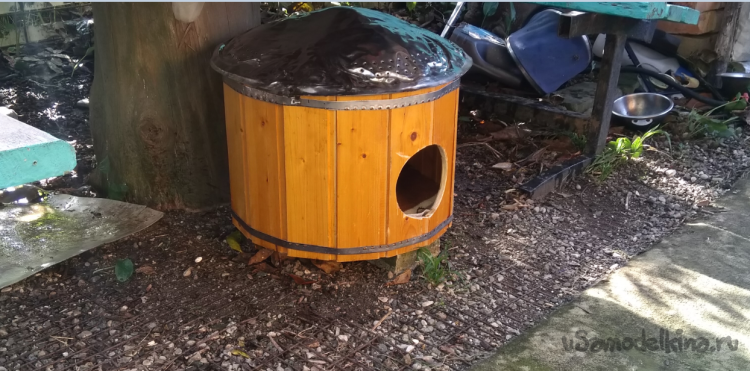 Моя коха вольная. У неё есть излюбленные места, где она может понежиться и поспать. Причём жесткость, на чём полежать для неё значения особого не имеет. На внешнем блоке кондиционера, просто на кирпичах, в огороде под пальмочкой. Ей везде хорошо! Но хорошо, когда погода хорошая, а в ненастье ей нужен домик. Вот такой домик я ей и построил.