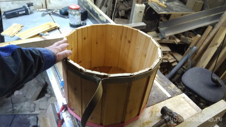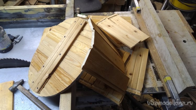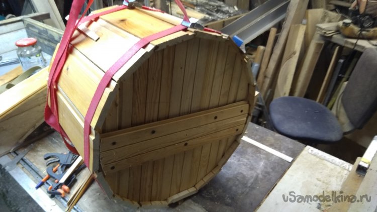Сборка предварительная на чемоданных стяжках, тут надо приловчиться чтобы пакет стенок не рассыпался. Подсовывая последовательно боковые плашки, подтягивал ремни и добавлял следующие плашки. За счёт того что в пропилы вставлялось донышко, а в планках боковых пазы и гребни с другой стороны, вся конструкция вполне устойчива. На фото видно что я укоротил гребни, для того чтобы при создании радиуса не ломало пазы на ответной части. Вагонка в щит собирается довольно плотно, для того чтобы образовать круглую стенку, пропилил на циркулярке пошире пазы и укоротил гребни с другой стороны.