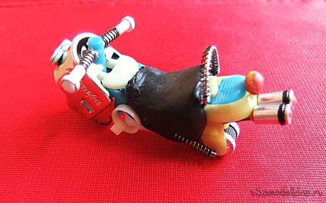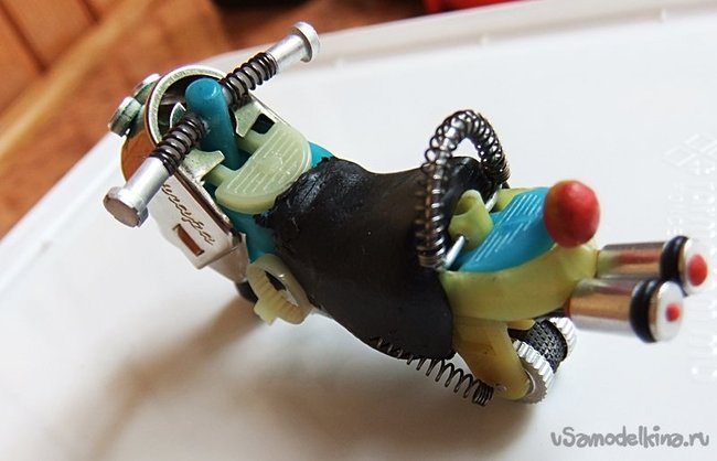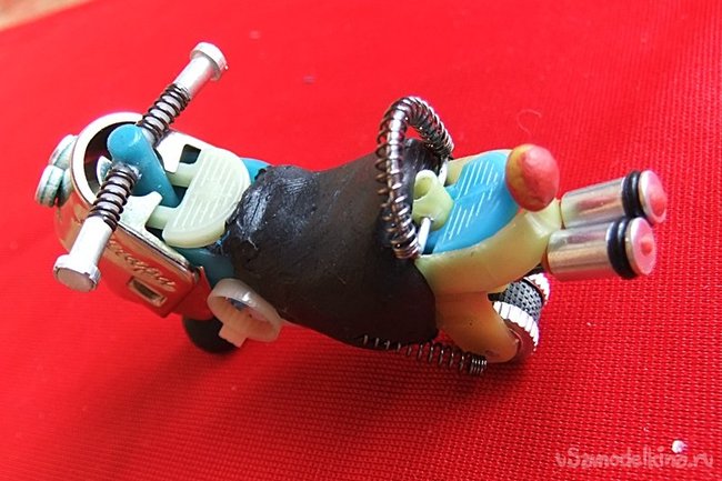 Получились две половины мотоцикла,которые необходимо объединить в одно целое. Для этой цели готовится эпоксидная замазка.Чтобы получить черный цвет- в нее нужно добавить сажи или сухой китайской туши. Склеиваем замазкой обе половины мотоцикла,придав ей форму седла. Вдавливаем амортизаторы заднего колеса и двигателя (на фото это видно) и даем затвердеть замазке.