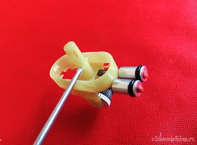На фотографии видно - какие детали получились в результате разборки,их количество и внешний вид.Занимаемся рулевой колонкой мотоцикла. Для этого используется головная часть зажигалки, в стойке которой просверливается отверстие. Практически - прокалывается шилом и растачивается надфильком для установки деталей руля.