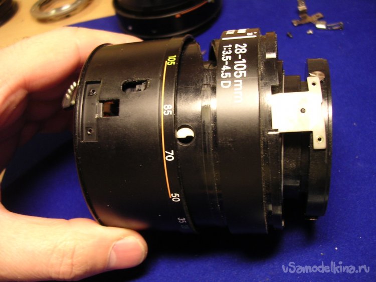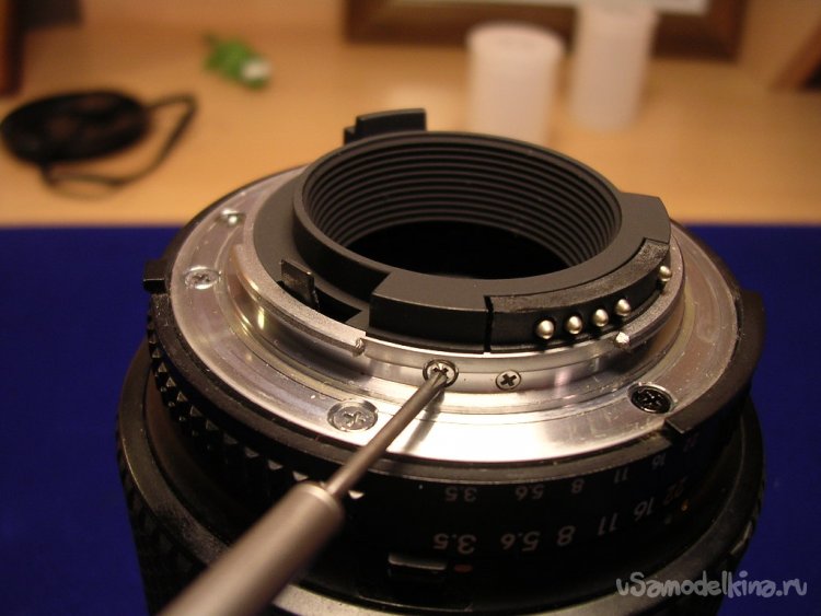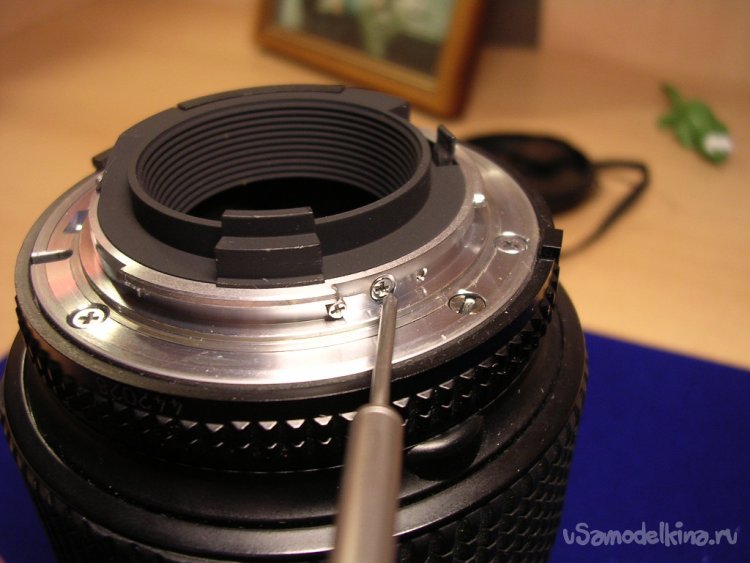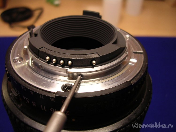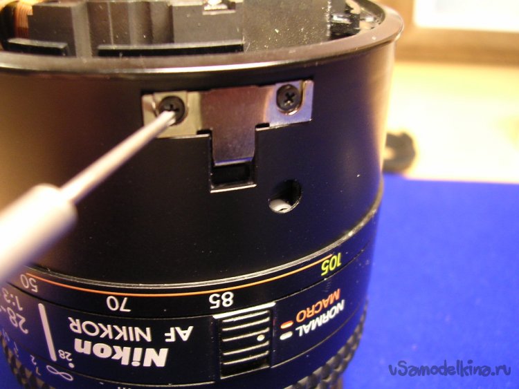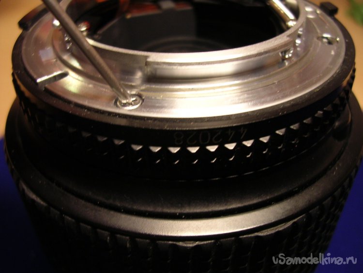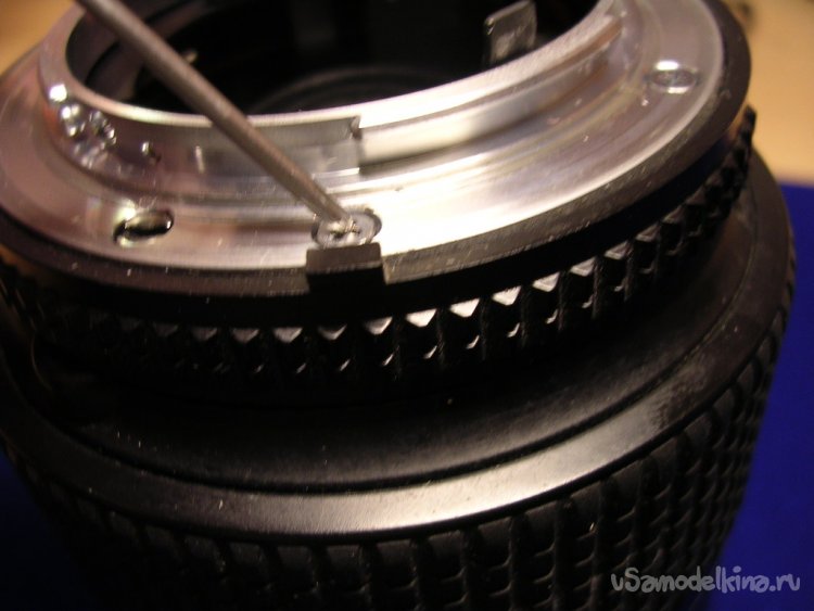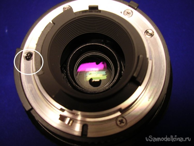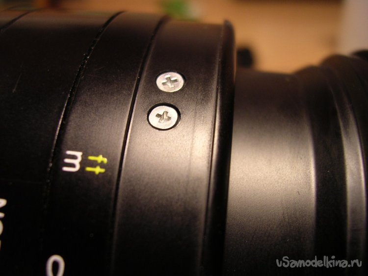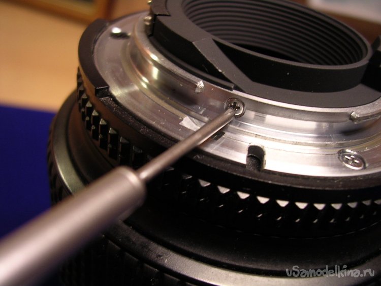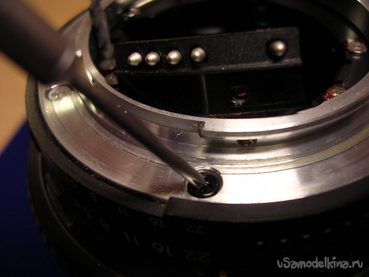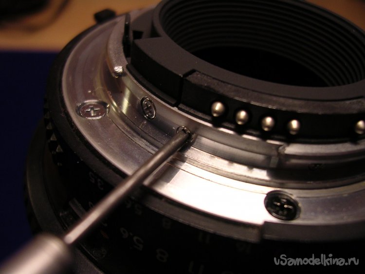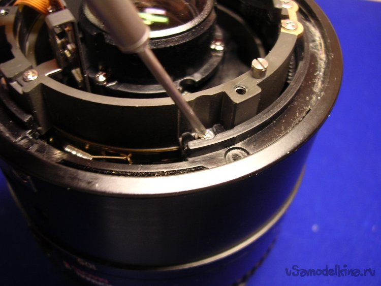 После этой операции можно выкрутить пины которые скользят по внутренним прорезям объектива и перемещают внутренние блоки линз. Их головы почему то под шлицевую отвертку.