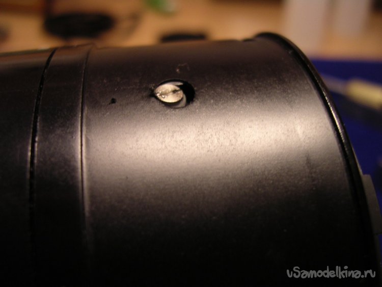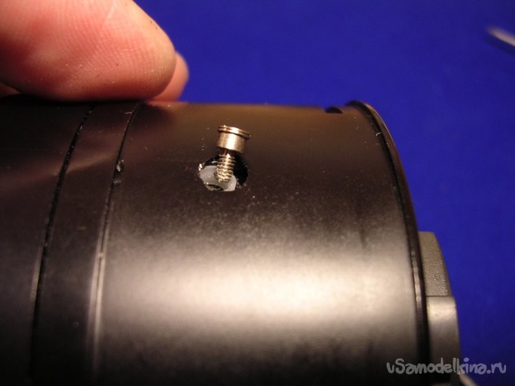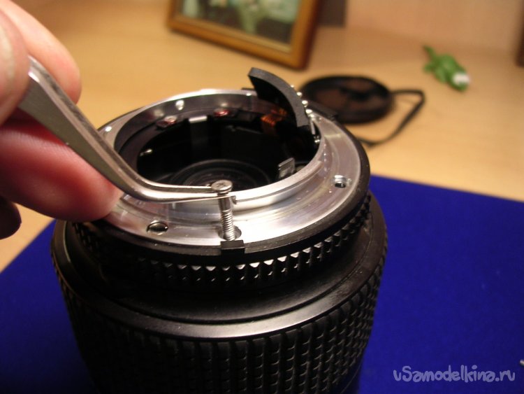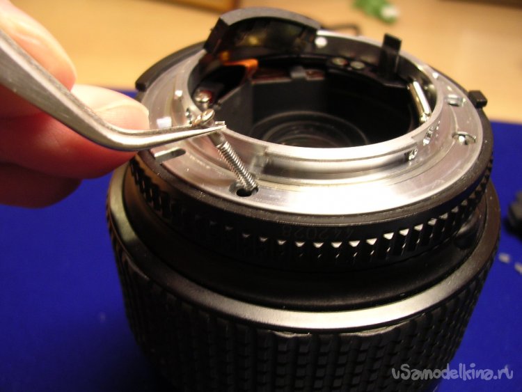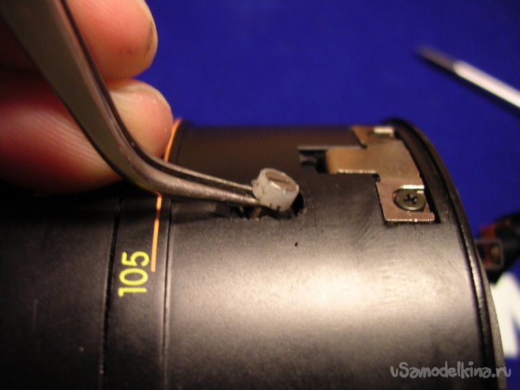 Очень аккуратно извлекаю болтик стараюсь не двигать объектив. Внутри осталось уплотнительное капролоновое колечко. Иногда удается его извлечь вместе с болтиком. Иногда нет, как в этом случае. Осторожно кривым пинцетом извлекаю колечко.
