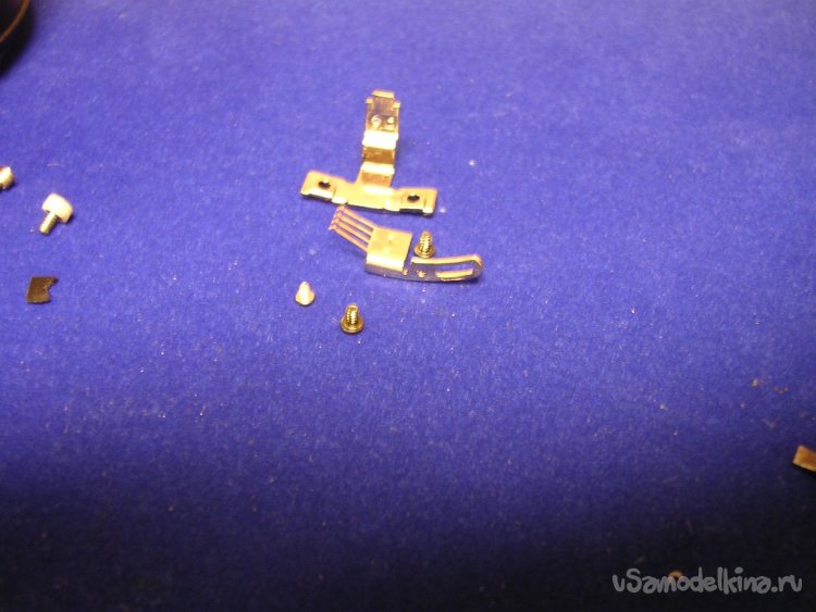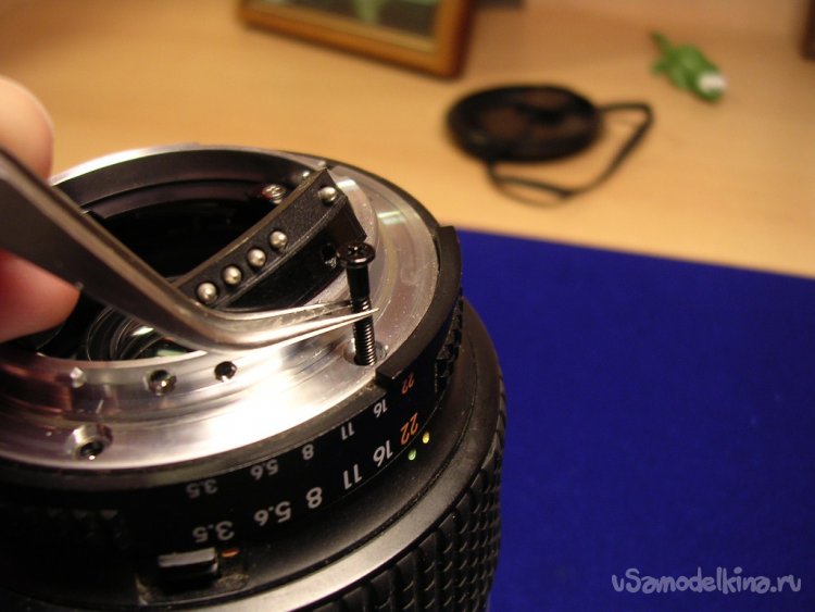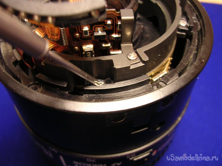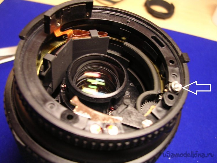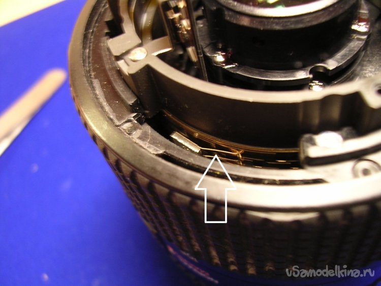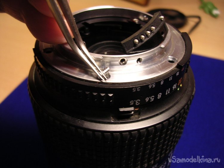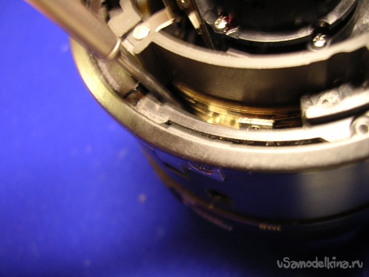 В промежутках между кольцами установлена гребенка положений. Откручиваю винтик крепления, одновременно придерживая её пинцетом. Главное не повредить тоненькие контакты и не уронить внутрь объектива. Гребенка извлечена.