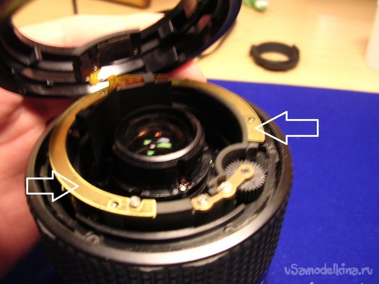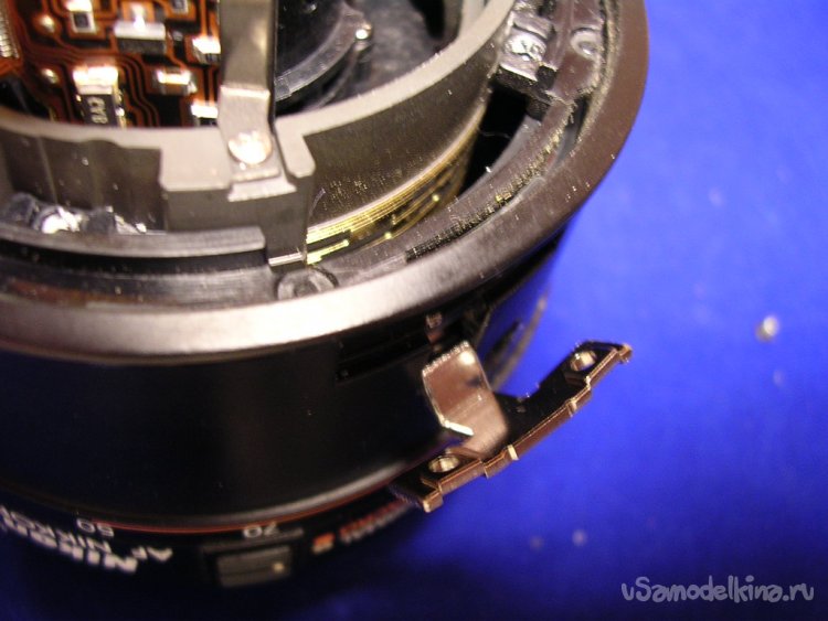 Кольцо защиты снято. Контактную группу нет нужды полностью снимать, она остается висеть на шлейфе. Это не лень, разумный рационализм. Только ворочать объектив нужно аккуратно, не порвать шлейфы.