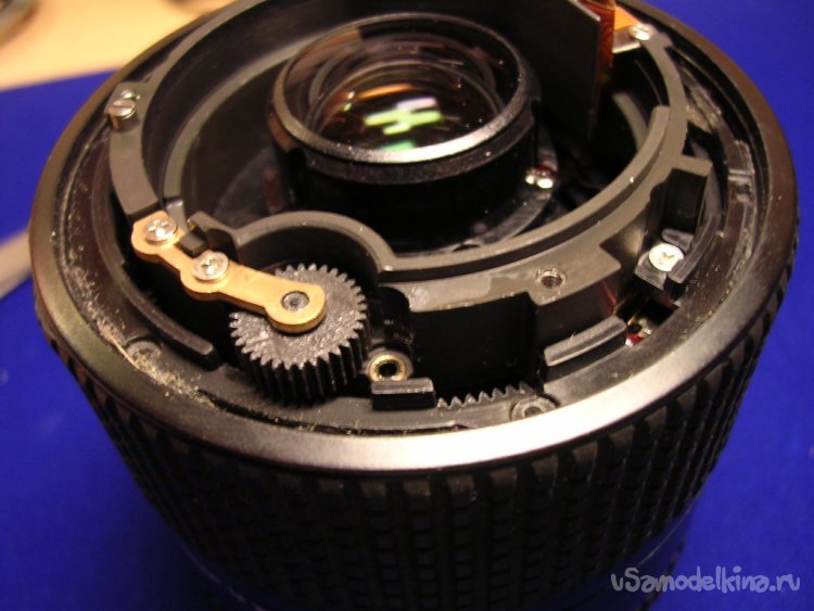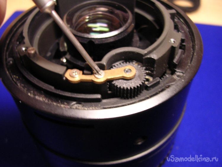 Нужно разобрать и снять шестеренки привода фокуса. Откручиваю маленькие винтики, спрятанные в глубине, затем винтики пластины кондуктора крепящей оси шестеренок. И наконец, извлекаю шестеренки.
