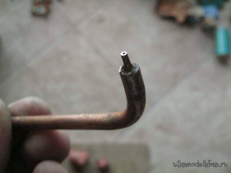 Держатель сопла – нетолстая, внешним диаметром - 6 мм, медная трубка. Ее кусочек отжег (Фото 3) аналогично капилляру, плотно набил сухим песком и заткнул деревянными пробками. В слесарных тисках, между брусочками из мягкого дерева, согнул заготовку на оправке (Фото 4), удалил пробку, вычистил от песка.