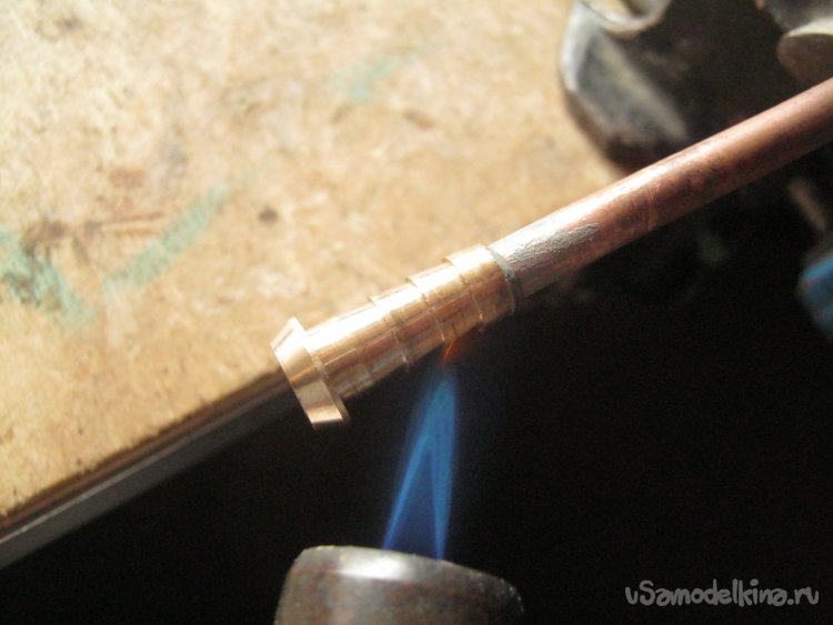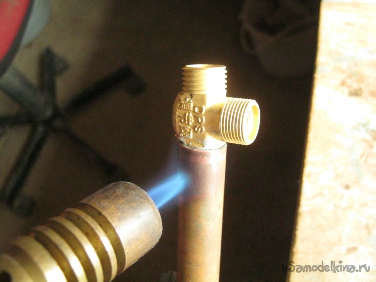 В качестве ручки-корпуса горелки применил отрезок медной водопроводной трубы Ø 15 мм. Зачистил конец трубы, подогнал к нему входную часть краника – пришлось подточить мелким напильником резьбу до плотной посадки. Спаял мягким припоем олово-медь – эта часть уже не будет сильно нагреваться. Пайка огневая, со специальной пастой-флюсом (Фото 8).