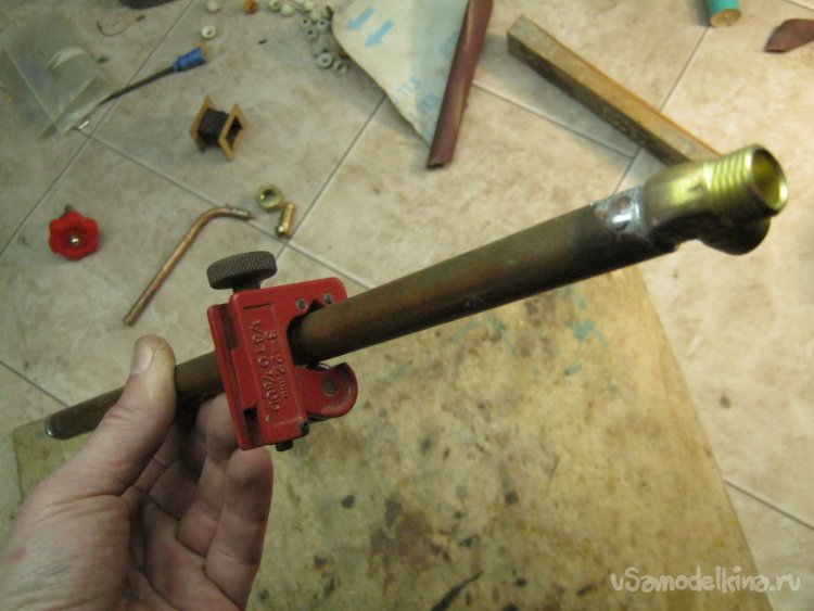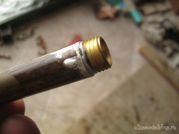 Фото 13. Впаянная в нижнюю часть ручки-трубки присоединительная резьба. Паял тем же оловянным безсвинцовым (не нужно всякий раз тщательно мыть руки) припоем, с флюсом для огневой пайки. По остывании – отмыть остатки.