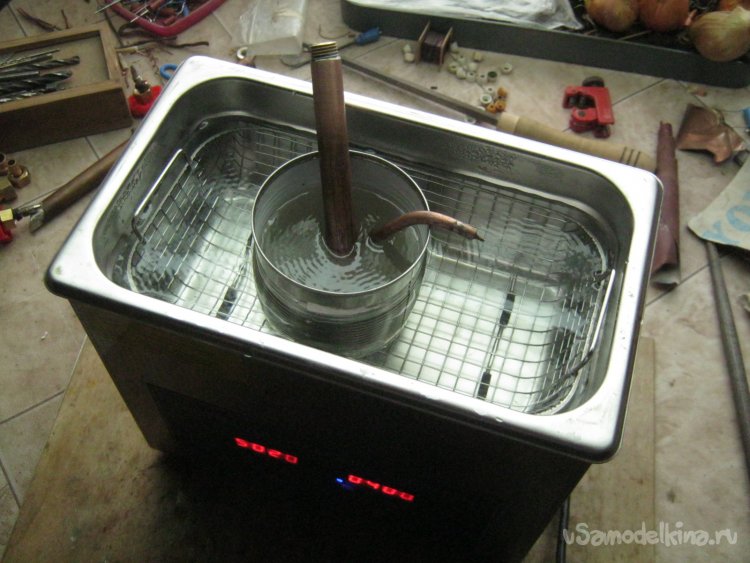 Фото 15. Для отмывки остатков кислотного флюса в труднодоступных местах применил ультразвуковую мойку. Отдельная емкость позволяет экономить химикаты и не пачкать ими всю емкость. Первый цикл – в нейтрализующем растворе кальцинированной соды, второй – в чистой воде.
