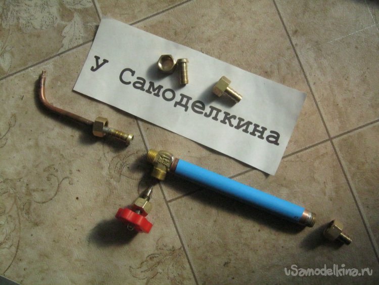 Фото 16. Части горелки. На ручку усадил кусок термотрубки. Два запасных присоединительных штуцера (на бумажечке) с накидными гайками позволят, при необходимости, дополнить горелку сменными насадками.