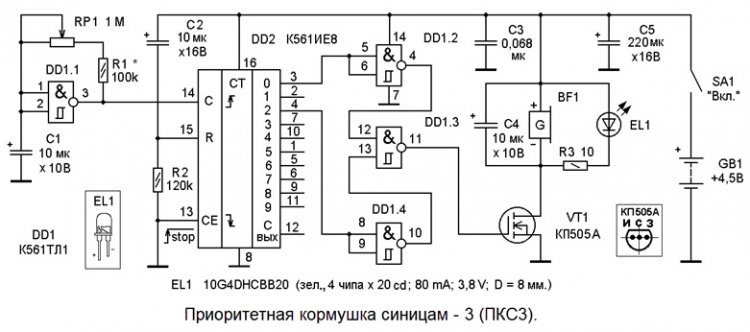 Приоритетная кормушка синицам – 3 (далее просто ПКС3) предназначена для отпугивания воробьёв (синицы к ПКС3 привыкают быстрее и почти не боятся её). Зуммер и осветительный светодиод, составляющие выносной излучающий блок, устанавливаются на кормушке или в непосредственной близости от насыпанного корма. Включать ПКС3 следует, если холодно и воробьи моментально тучей заполняют кормушку, оттесняя синиц. Сначала, после включения ПКС3 могут испугаться все птицы и недалеко отлететь от кормушки, но наиболее смелые синицы первыми вернутся к корму, даже если ПКС3 будет включён. Минуту спустя ПКС3 можно выключить, чтобы снять настороженность и у остальных менее смелых синиц. Воробьи будут издалека наблюдать за кормлением и через некоторое время также вернутся к кормушке, но к этому времени синицы уже не будут голодными. Включать ПКС3 можно по мере необходимости, когда нужно дать возможность поесть и синицам.