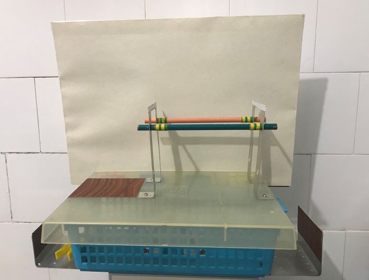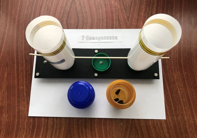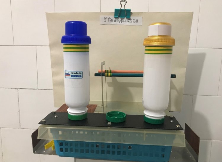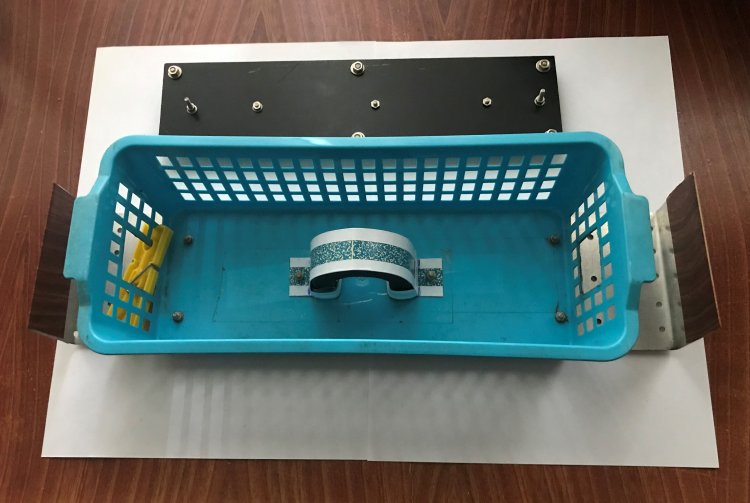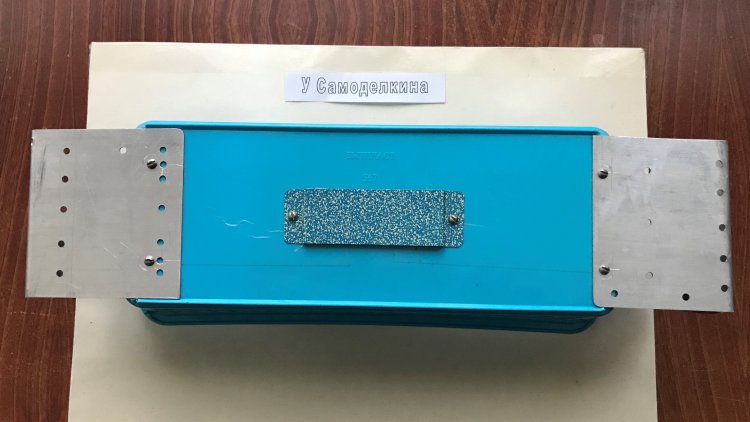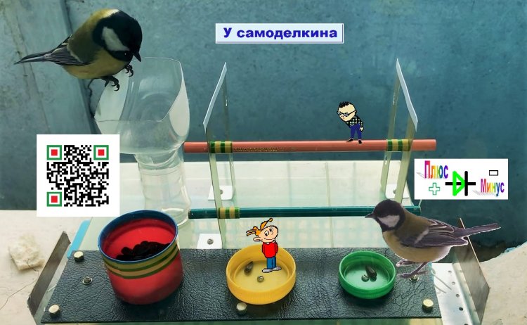 Доработанная кормушка ДКТС в собранном виде с двумя контейнерами для семечек приобретает вид, изображённый на рисунке 16. Экран для фотосессии крепится задней стенке кормушке с помощью цветных зажимов для бумаг. Для прочного удержания экрана достаточно от 1 до 3 таких зажимов. Четвёртый зажим установлен сверху экрана и удерживает логотип «У Самоделкина».