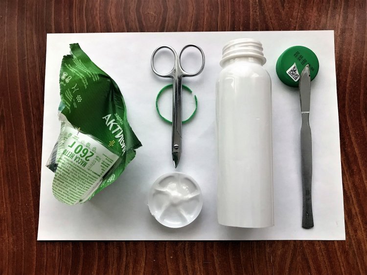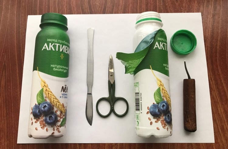 Далее показан алгоритм изготовления одного из двух контейнеров. Берётся бутылочка от питьевого йогурта «Активиа», крышка откручивается, содержимое выпивается, а декоративная плёнка – этикетка отделяется от корпуса с помощью скальпеля (ножа) и ножниц.