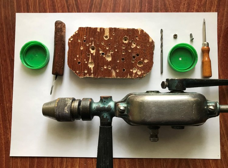 Зелёная крышка бутылочки дорабатывается. В ней шилом намечается центр отверстия. Отверстие делается сверлом диаметром 3 … 3,2 мм на деревянном бруске (чтобы нечаянно не просверлить декоративную поверхность рабочего стола). Проще применить не ручную, а электродрель. Тогда крышку не потребуется закреплять на столе струбциной.