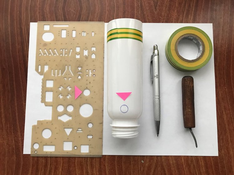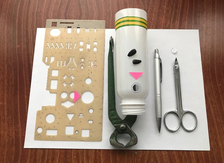 Итак, для разметки отверстий используем, например, офицерскую линейку или другой трафарет. При отсутствии полумягких трафаретов можно применить циркуль-балерину из чертёжной готовальни. Диаметр отверстия следует выбрать 1,8 … 2 см и начертить его несколькими оборотами шариковой ручкой с двух противоположных сторон. Для того, чтобы ручка хорошо писала на полиэтиленовом контейнере, её предварительно следует слегка «расписать» на бумаге. После разметки, центр намеченного отверстия протыкается шилом. Для вырезания отверстия также используют полукруглые ножницы. Неаккуратно вырезанное отверстие следует слегка оплавить паяльником, чтобы убрать заусеницы, о которые птицы могут поцарапать свой клюв.