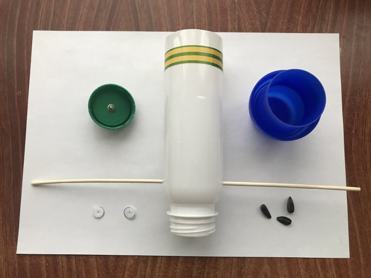 Все детали, необходимые для сборки одного контейнера приведены на рисунке 9. Вырезанные кружки (слева, снизу) выбрасываются. Крышка для контейнера взята от пластиковой бутыли для жидкого средства для стирки «LOSK». А деревянный бамбуковый шампур лишь показывает, что в контейнере два симметрично расположенных отверстия. Однако скрепив 4 таких шампура изолентой, можно получить удобную для птиц жёрдочку для расклёвывания семечек. Полоса из двух слоёв жёлто-зелёной изоленты показывает уровень, до которого в контейнер рекомендуется засыпать семечки, чтобы крышка смогла плотно и полностью установиться в контейнер.