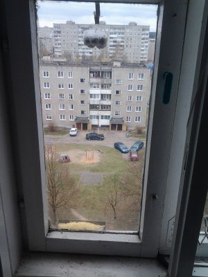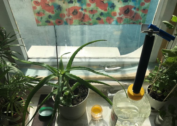 Для съёмки, металлический козырёк за кухонным окном был очищен от известной голубиной грязи, покрашен и закрыт толстой полиэтиленовой плёнкой. Неприглядная балконная железобетонная плита была завешена моющимся декоративным ковриком.