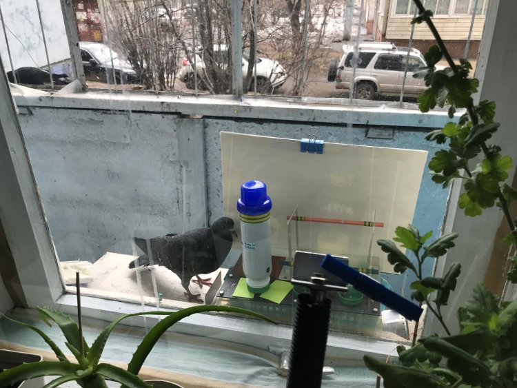 К установленной ДКТС на своё запланированное место голуби подходят из любопытства, но о наличии семечек в кормушке не догадываются. А если позже и догадаются, то из-за наличия места только для маленьких птиц, голуби протискиваться на такую доработанную кормушку вряд ли будут. К тому же рядом (в 2 метрах) от ДКТС расположена кормушка для голубей. В левом верхнем углу виден другой голубь, усердно клюющий крупу на голубиной кормушке.