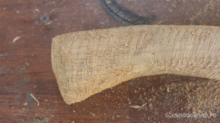 После нанесения разметки на дубовую заготовку я принесу выпиливать её. В этом мне помог лобзик. Придав заготовке правильную форму настал момент работы в другой плоскости, теперь необходимо сделать правильною толщину из закруглить заготовку. В этом мне помогла уже дрель с абразивным диском по дереву. Этот диск любое дерево просто за секунды придаёт дереву желаемую форму, но в болгарке в данном случае использовать мне, было неудобно, поэтому я его закрепил в дрель через переходник.