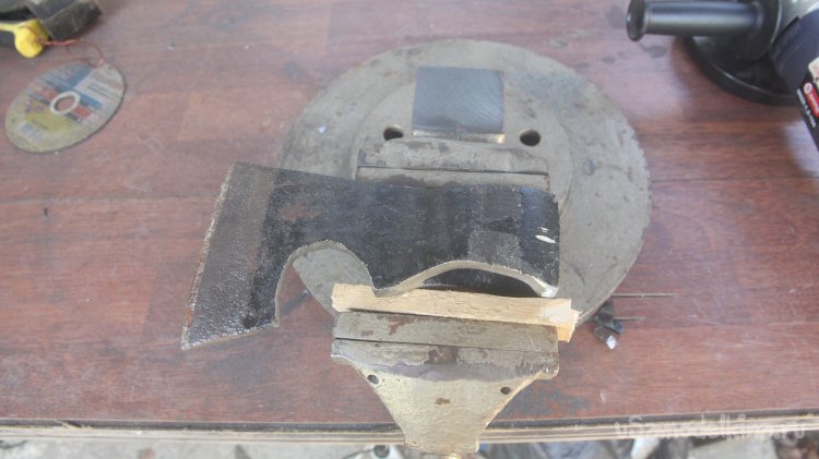 И так, для начала, я снял голову топора с топорища. Отпилил верхнею часть, что бы придать горизонтальный вид. Дальше я принялся запиливать полукруг в нижней части топора, полукруг конечно получился почти идеальный, но не совсем, довести до конца я просто поленился намного. Интереснее если его выводить уже не болгаркой, а например: прямой шлифовальной машиной, или коронкой по металлу сразу вырезать полукруг. Для коронки нужно уже использовать сверлильный станок, работу со сверлильным станком я покажу и опишу немного позже.
