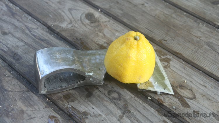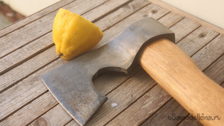 Теперь самое интересное. В этой работе я решил попробовать сделать эффект воронения, но чтобы было интересно и я решил его сделать с помощью лимона. Заводского воронения конечно не получить, но домашний способ с лимонной кислотой имеет право на существование. Единственное, что я поправил в домашнем способе, я использовал сам лимон, а не лимонную кислоту, так работа становиться интересней. Для того чтобы оксидная плёнка была более стойка я натирал лимоном топор, грея его одновременно феном на открытом воздухе, это помогло мне сократить время работы, по итогу топор приобрел красивый серый цвет. Обработать я попробовал не маслом, а силиконом, получилось весьма неплохо.