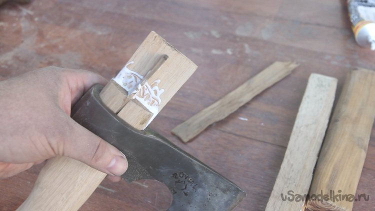 После этих манипуляций я насадил топор на топорище, клинья в топорище сделал крестом, так как клин один, мне не особо направиться, один клин можно использовать на маленьких топорах забивая его по диагонали. Обязательно коленья я смазываю клеем ПВА.