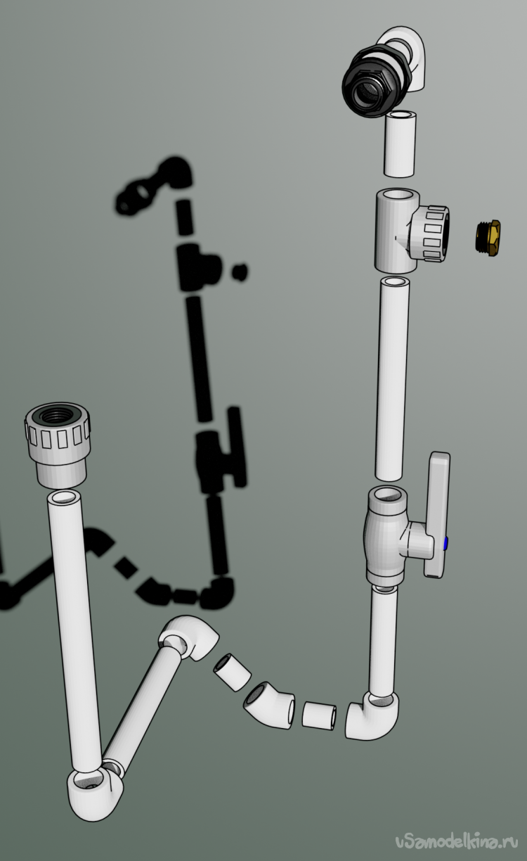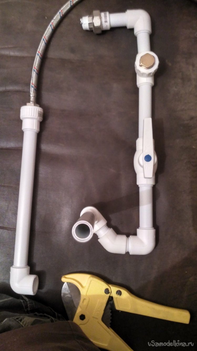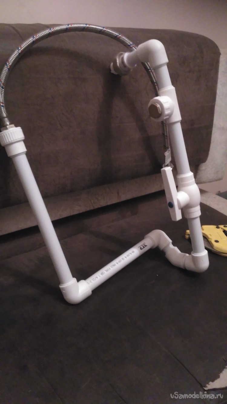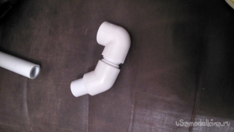 Собираем гибкий шланг, уголок на 90 и трубу на 40 см воедино. В итоге получилось две вот такие детали.