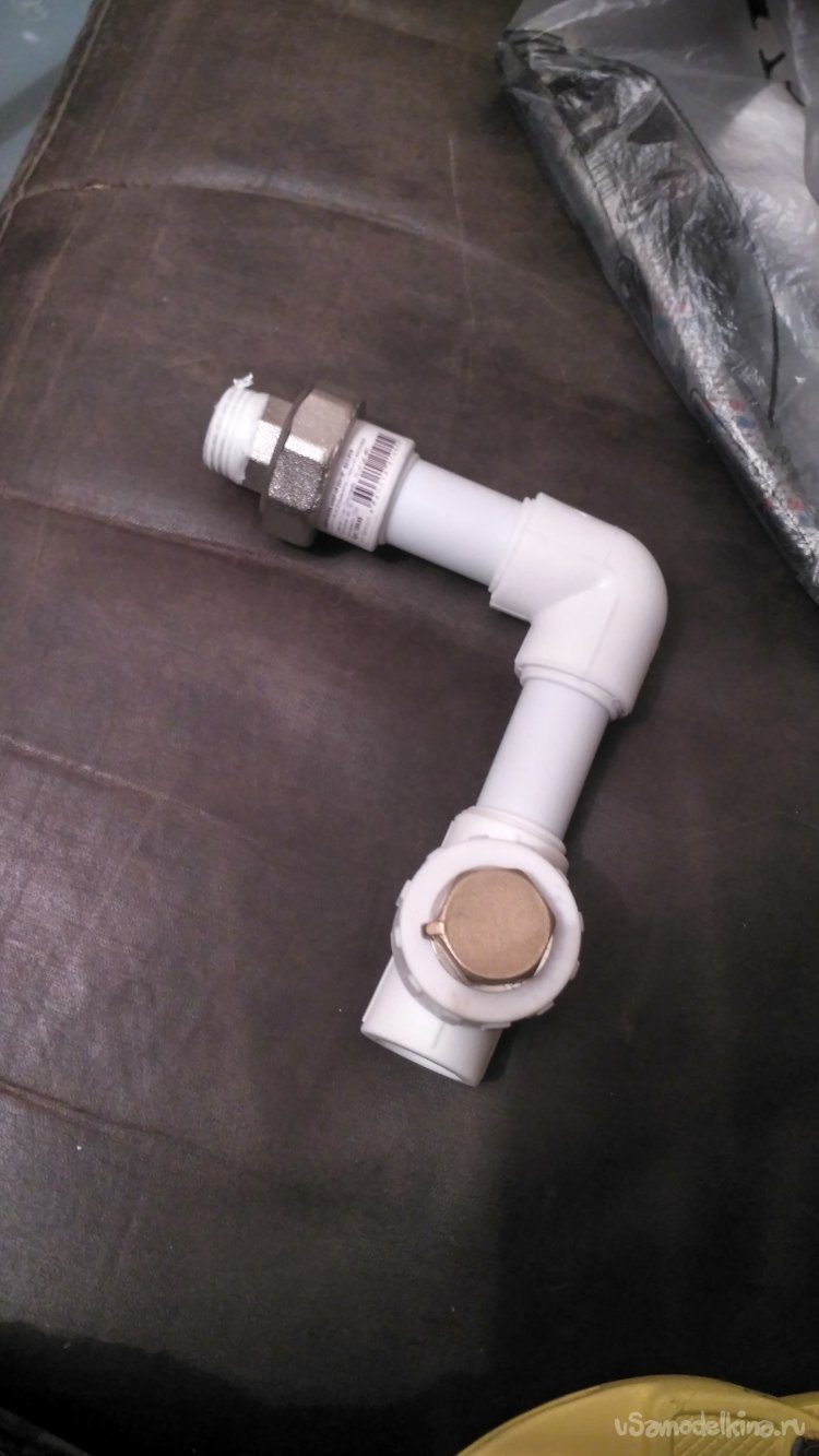 Скрепляем «американку», уголок на 90 и тройник, предварительно закрутив в последний заглушку, плотно обмотанную уплотнителем. Это отверстие предназначается для подключения в будущем более объёмного накопителя.