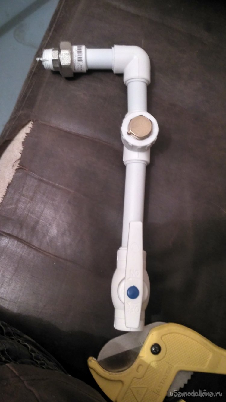 Также добавляем к получившейся конструкции кран. С ним нужно быть осторожнее, поскольку он пластиковый, и при нагреве может уменьшится герметичность.