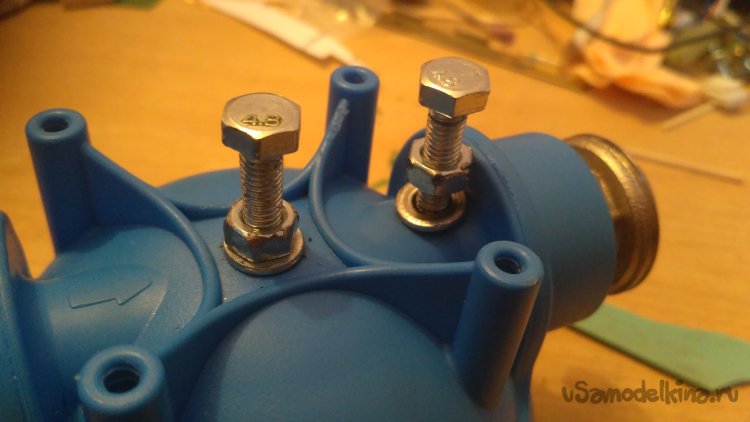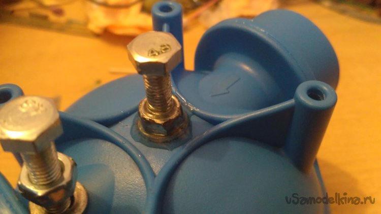 По процессу - просверливаются два отверстия на 5, а лучше на 4 мм в крышке фильтра. Вкручиваем с внутренней и внешней стороны по гайке и шайбе, предварительно подлив клея. После первичной фиксации густо заливаем все стыки болтов и крышки «соплями».