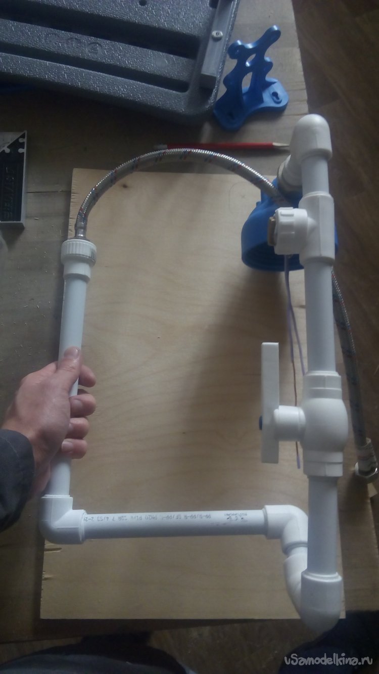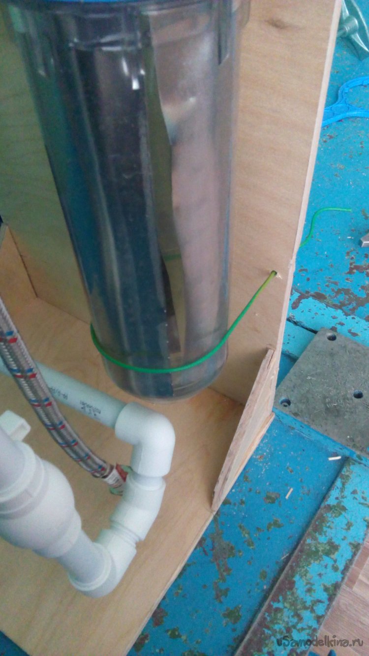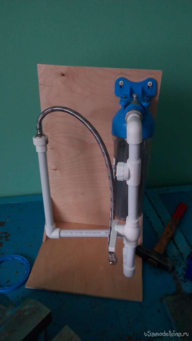 Само собой разумеющееся то, что в виде фильтра и труб установка неудобна в применении. Поэтому обязательно нужна какая - то стойка. И я её сделал. Для этого потребовался лист фанеры.